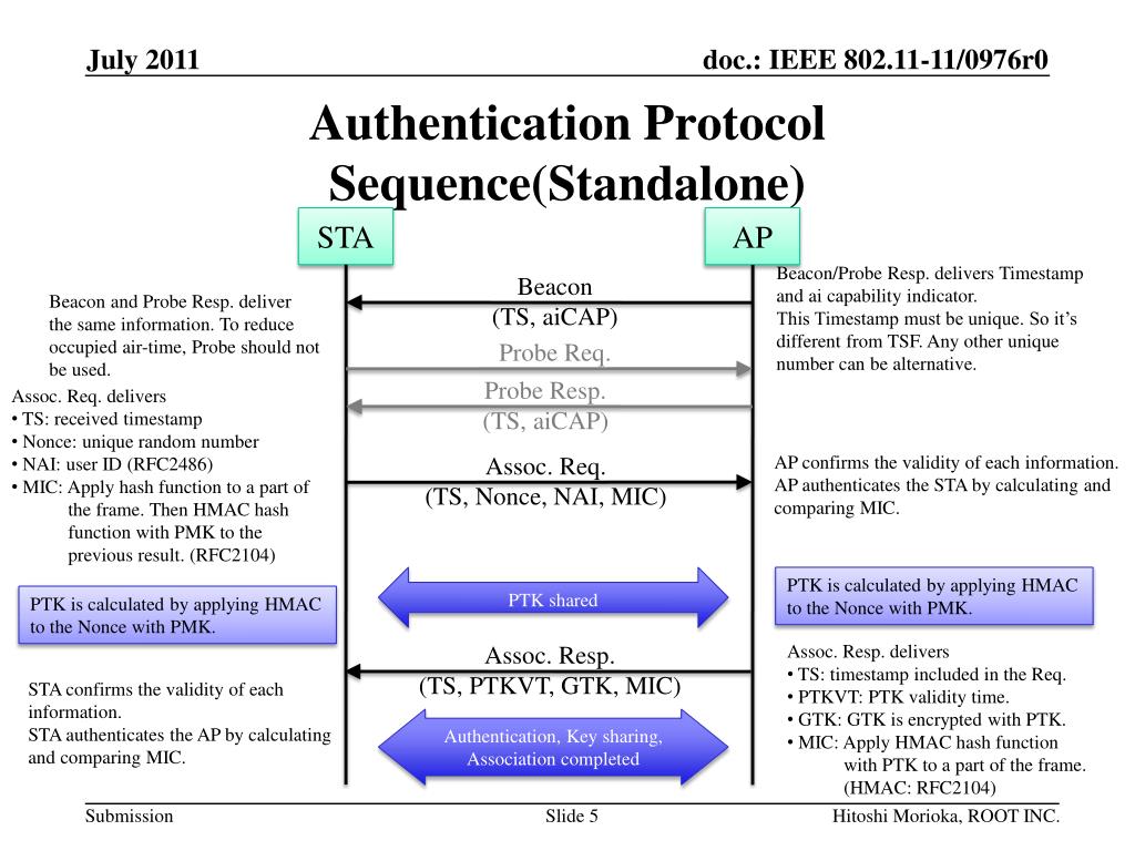 Authentication Protocol Sequence(Standalone) STA AP Beacon/Probe Resp. delivers Timestamp and ai capability indicator. This Timestamp must be unique. So it’s different from TSF. Any other unique number can be alternative. Beacon (TS, aiCAP) Beacon and Probe Resp. deliver the same information. To reduceoccupied air-time, Probe should notbe used. Probe Req. Probe Resp. (TS, aiCAP) • Assoc. Req. delivers • TS: received timestamp • Nonce: unique random number • NAI: user ID (RFC2486) • MIC: Apply hash function to a part of the frame. Then HMAC hash function with PMK to the previous result. (RFC2104) Assoc. Req. (TS, Nonce, NAI, MIC) AP confirms the validity of each information.AP authenticates the STA by calculating andcomparing MIC. PTK shared PTK is calculated by applying HMAC to the Nonce with PMK. PTK is calculated by applying HMAC to the Nonce with PMK. Assoc. Resp. (TS, PTKVT, GTK, MIC) • Assoc. Resp. delivers • TS: timestamp included in the Req. • PTKVT: PTK validity time. • GTK: GTK is encrypted with PTK. • MIC: Apply HMAC hash function with PTK to a part of the frame. (HMAC: RFC2104) STA confirms the validity of each information.STA authenticates the AP by calculating and comparing MIC. Authentication, Key sharing, Association completed Hitoshi Morioka, ROOT INC.