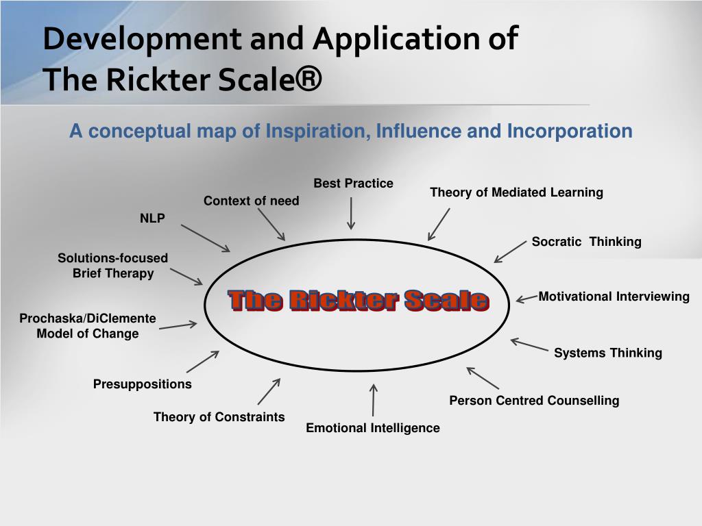 Development and Application of The Rickter Scale® • A conceptual map of Inspiration, Influence and Incorporation Best Practice Theory of Mediated Learning Context of need NLP Socratic Thinking Solutions-focused Brief Therapy Motivational Interviewing The Rickter Scale Prochaska/DiClemente Model of Change Systems Thinking Presuppositions Person Centred Counselling Theory of Constraints Emotional Intelligence