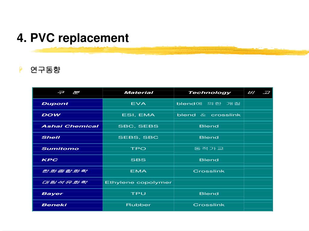 3. 환경친화성 인조피혁 Non-halogene Solvent-free PU Recycling 1. PVC leather : Cl2 gas, Plasticizer, additive etc. 2. Synthetic leather : DMF, MEK, Toluene, 폐기물 etc. 3. Artificial leather : DMF, MEK, Toluene, 폐기물 etc.