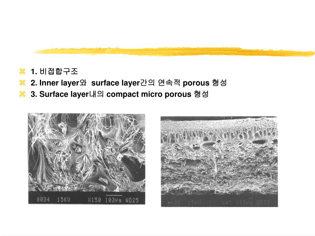 1. 비접합구조 • 2. Inner layer와 surface layer간의 연속적 porous 형성 • 3. Surface layer내의 compact micro porous 형성
