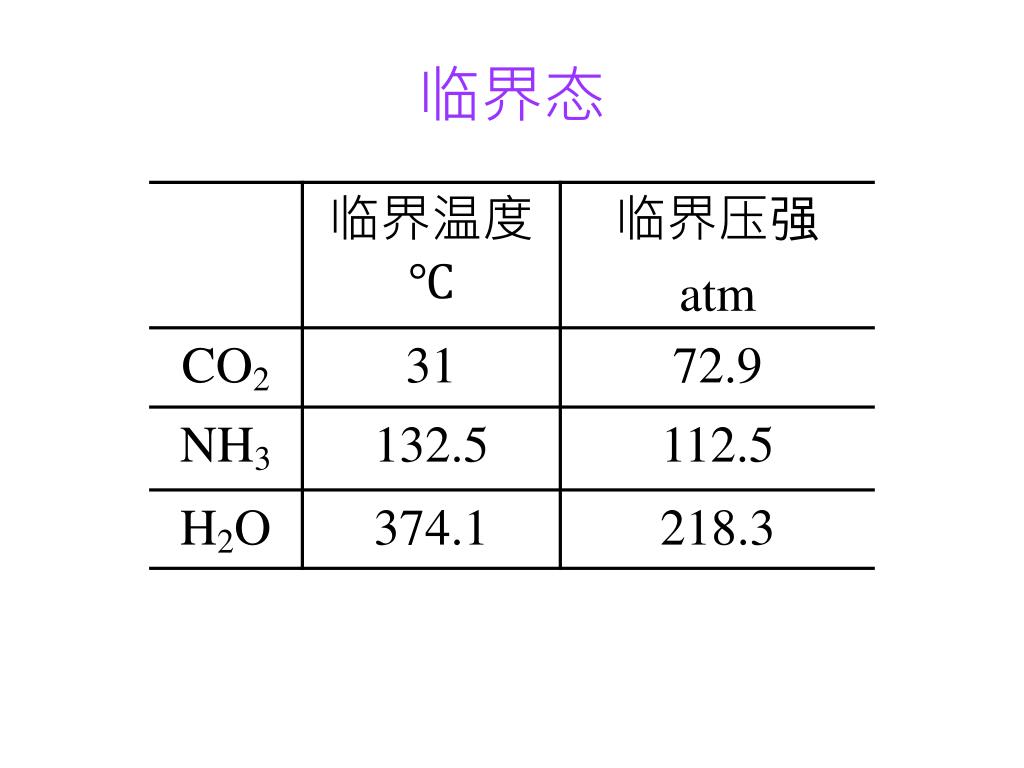 临界态 气态和液态的密度不同,因而气液间存在着明显的界面。 加压可使气相密度增大;加温可使容器中的液相不断膨胀,密度则随之不断地下降。当温度和压强分别上升到一定程度时,两相的密度趋于相等, 之间的分界线随之消失,这时容器内物质所处的状态就是临界态。 达到临界态时所要求的温度和压强分别称作临界温度和临界压强。