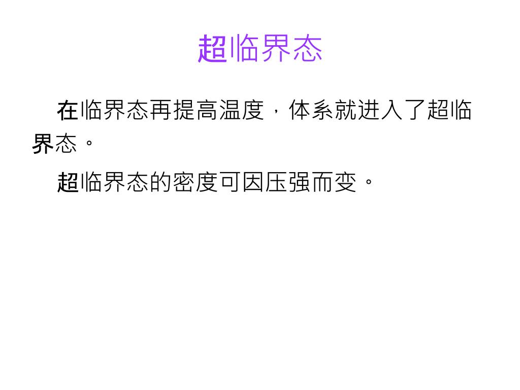 超临界态 在临界态再提高温度,体系就进入了超临界态。 超临界态的密度可因压强而变。