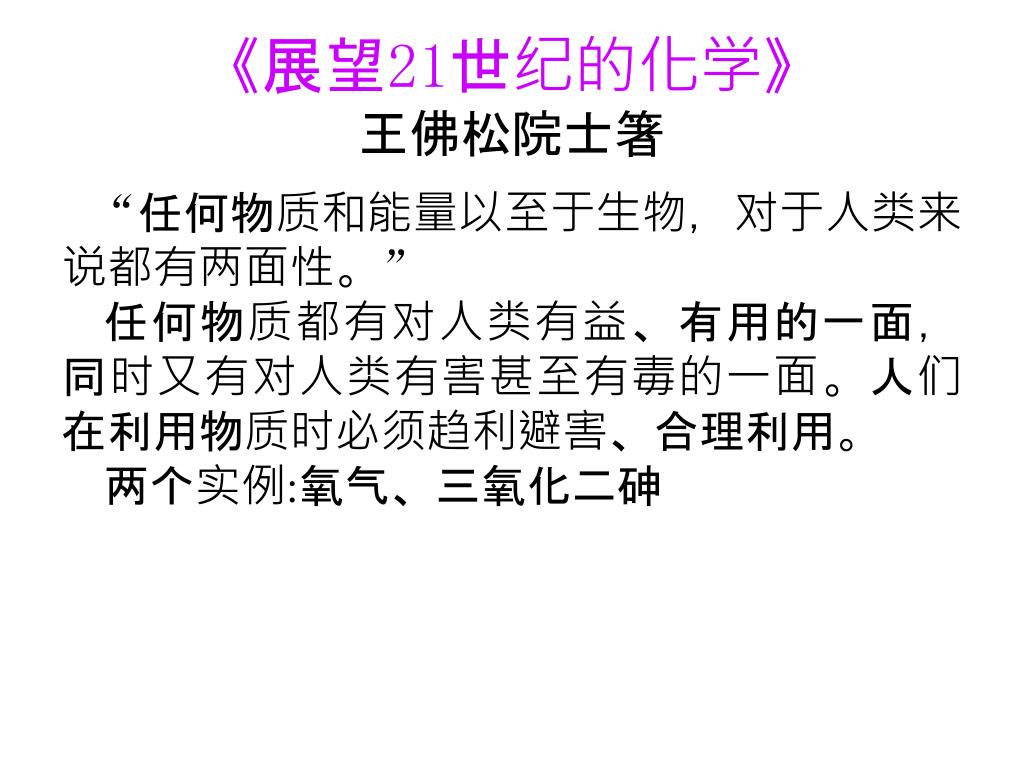《展望21世纪的化学》王佛松院士箸 “任何物质和能量以至于生物,对于人类来说都有两面性。” 任何物质都有对人类有益、有用的一面,同时又有对人类有害甚至有毒的一面。人们在利用物质时必须趋利避害、合理利用。 两个实例:氧气、三氧化二砷