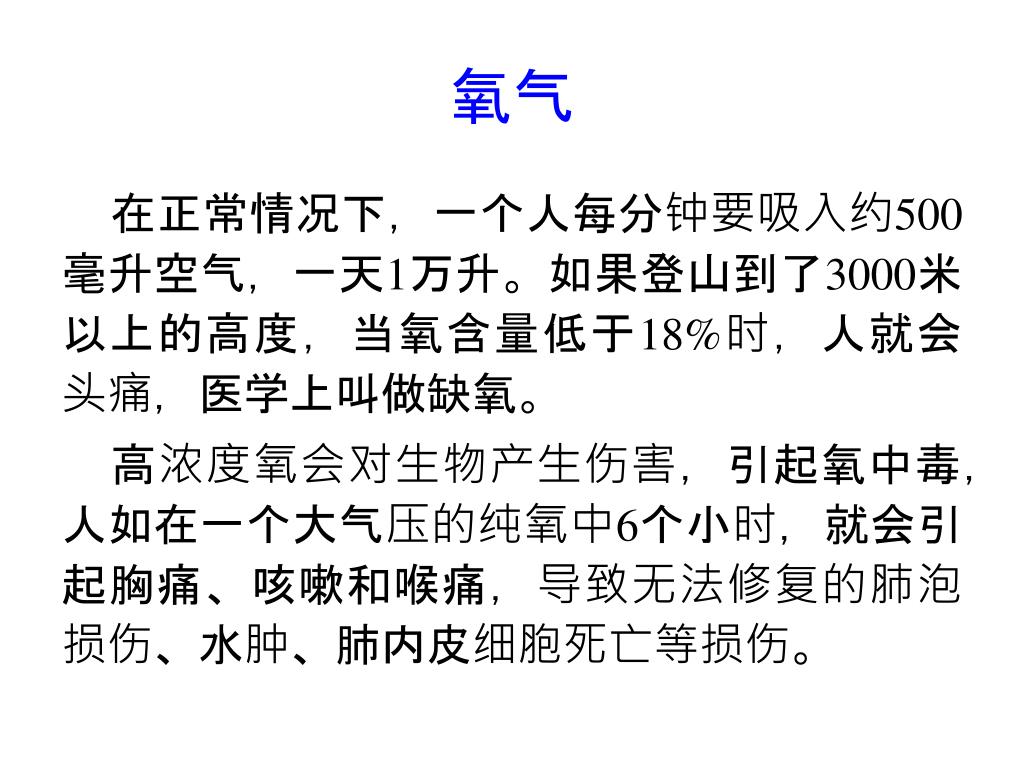 氧气 在正常情况下,一个人每分钟要吸入约500毫升空气,一天1万升。如果登山到了3000米以上的高度,当氧含量低于18%时,人就会头痛,医学上叫做缺氧。 高浓度氧会对生物产生伤害,引起氧中毒,人如在一个大气压的纯氧中6个小时,就会引起胸痛、咳嗽和喉痛,导致无法修复的肺泡损伤、水肿、肺内皮细胞死亡等损伤。