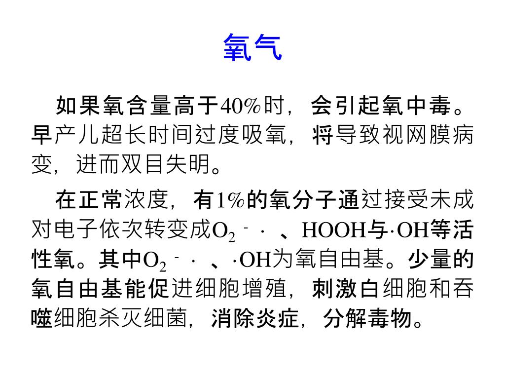 氧气 如果氧含量高于40%时,会引起氧中毒。早产儿超长时间过度吸氧,将导致视网膜病变,进而双目失明。 在正常浓度,有1%的氧分子通过接受未成对电子依次转变成O2 - · 、HOOH与·OH等活性氧。其中O2 - · 、·OH为氧自由基。少量的氧自由基能促进细胞增殖,刺激白细胞和吞噬细胞杀灭细菌,消除炎症,分解毒物。