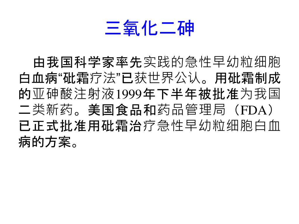 三氧化二砷 由我国科学家率先实践的急性早幼粒细胞白血病“砒霜疗法”已获世界公认。用砒霜制成的亚砷酸注射液1999年下半年被批准为我国二类新药。美国食品和药品管理局(FDA)已正式批准用砒霜治疗急性早幼粒细胞白血病的方案。