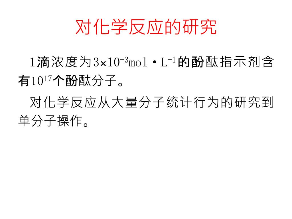 对化学反应的研究 1滴浓度为3×10-3mol·L-1的酚酞指示剂含有1017个酚酞分子。 对化学反应从大量分子统计行为的研究到单分子操作。