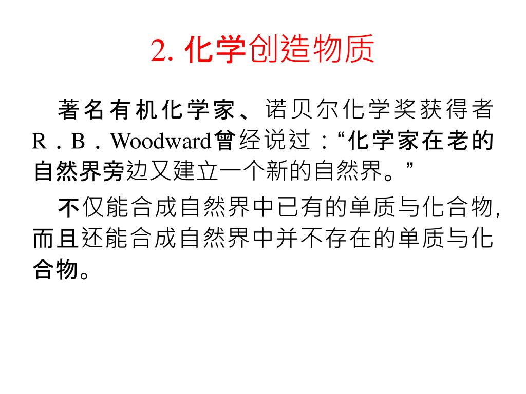 2.化学创造物质 著名有机化学家、诺贝尔化学奖获得者R﹒B﹒Woodward曾经说过:“化学家在老的自然界旁边又建立一个新的自然界。” 不仅能合成自然界中已有的单质与化合物,而且还能合成自然界中并不存在的单质与化合物。