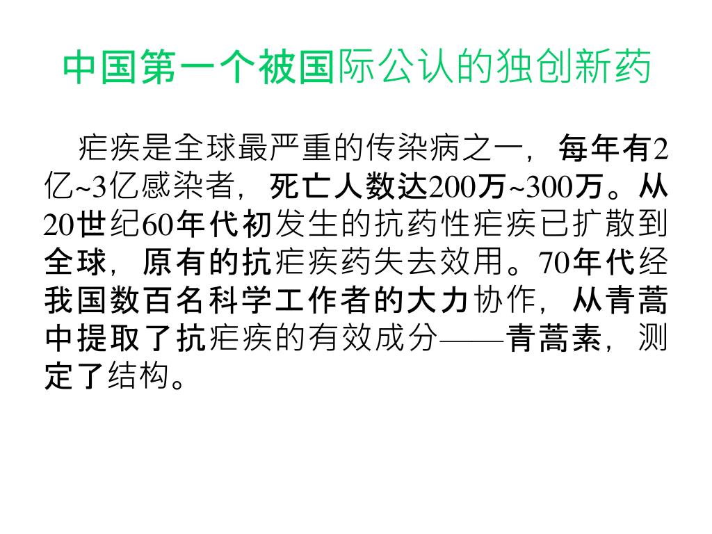 中国第一个被国际公认的独创新药 疟疾是全球最严重的传染病之一,每年有2亿~3亿感染者,死亡人数达200万~300万。从20世纪60年代初发生的抗药性疟疾已扩散到全球,原有的抗疟疾药失去效用。70年代经我国数百名科学工作者的大力协作,从青蒿中提取了抗疟疾的有效成分——青蒿素,测定了结构。