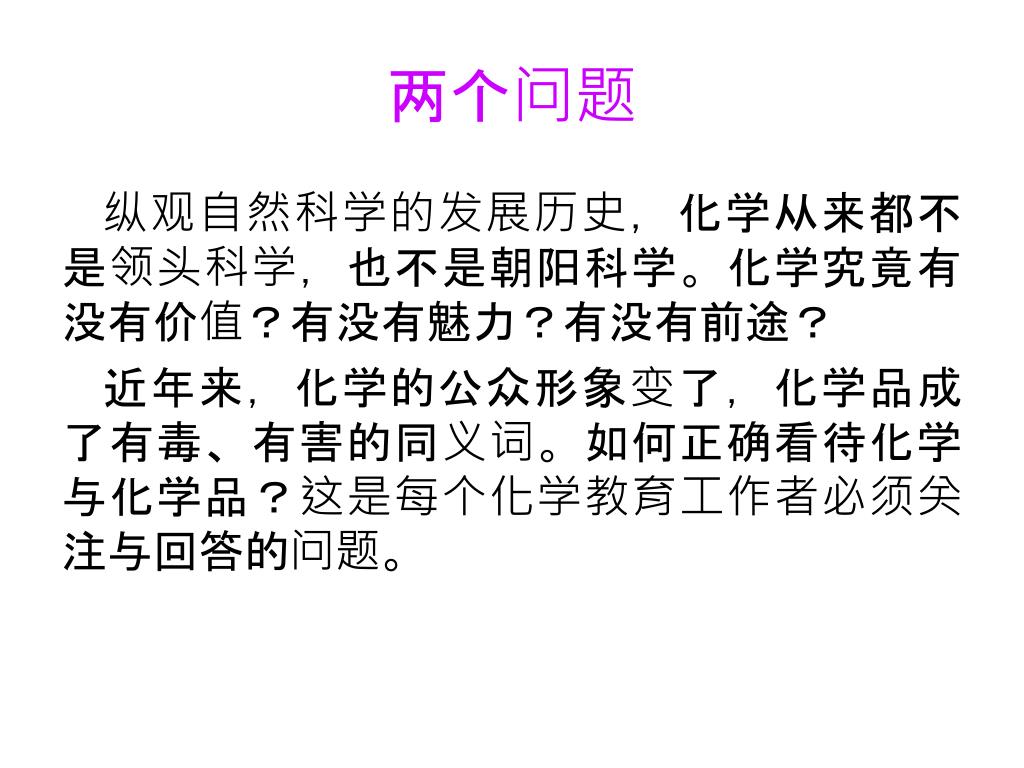 两个问题 纵观自然科学的发展历史,化学从来都不是领头科学,也不是朝阳科学。化学究竟有没有价值?有没有魅力?有没有前途? 近年来,化学的公众形象变了,化学品成了有毒、有害的同义词。如何正确看待化学与化学品?这是每个化学教育工作者必须关注与回答的问题。