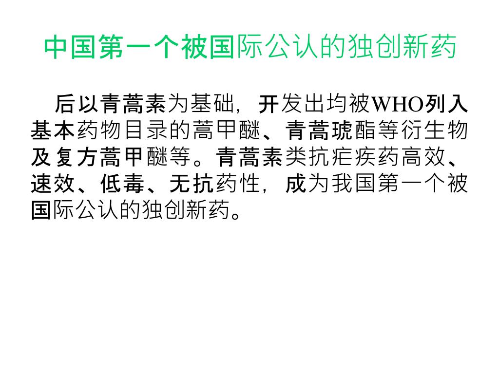 中国第一个被国际公认的独创新药 后以青蒿素为基础,开发出均被WHO列入基本药物目录的蒿甲醚、青蒿琥酯等衍生物及复方蒿甲醚等。青蒿素类抗疟疾药高效、速效、低毒、无抗药性,成为我国第一个被国际公认的独创新药。