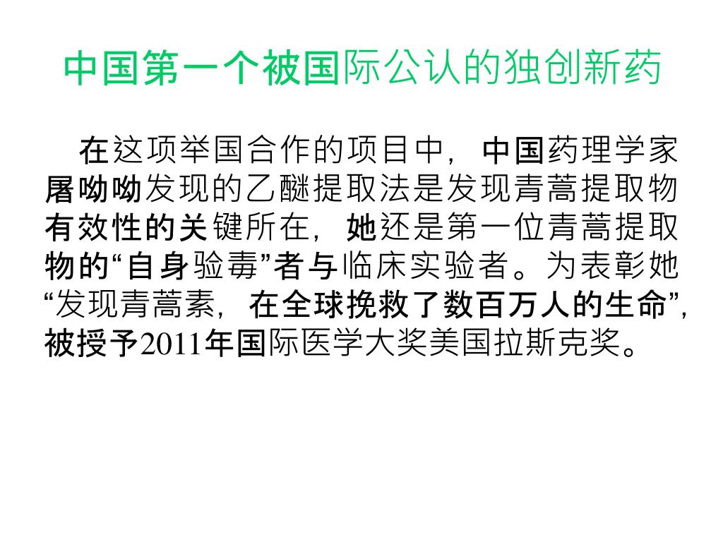中国第一个被国际公认的独创新药 在这项举国合作的项目中,中国药理学家屠呦呦发现的乙醚提取法是发现青蒿提取物有效性的关键所在,她还是第一位青蒿提取物的“自身验毒”者与临床实验者。为表彰她“发现青蒿素,在全球挽救了数百万人的生命”,被授予2011年国际医学大奖美国拉斯克奖。