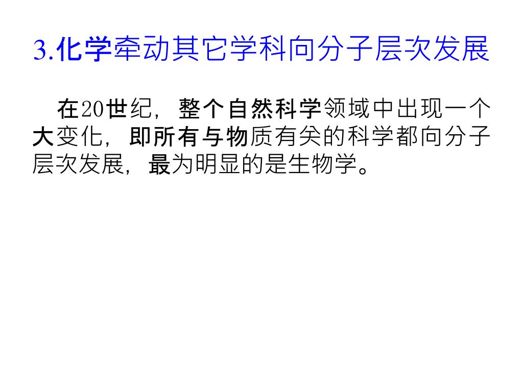 3.化学牵动其它学科向分子层次发展 在20世纪,整个自然科学领域中出现一个大变化,即所有与物质有关的科学都向分子层次发展,最为明显的是生物学。