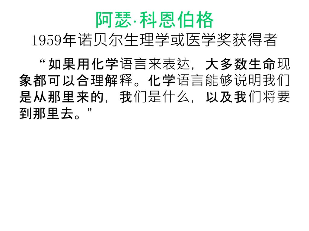 阿瑟·科恩伯格 1959年诺贝尔生理学或医学奖获得者 “如果用化学语言来表达,大多数生命现象都可以合理解释。化学语言能够说明我们是从那里来的,我们是什么,以及我们将要到那里去。”