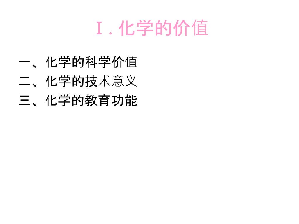 Ⅰ.化学的价值 一、化学的科学价值 二、化学的技术意义 三、化学的教育功能