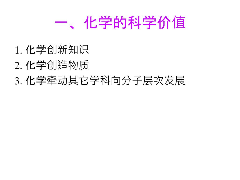 一、化学的科学价值 1. 化学创新知识 2. 化学创造物质 3. 化学牵动其它学科向分子层次发展