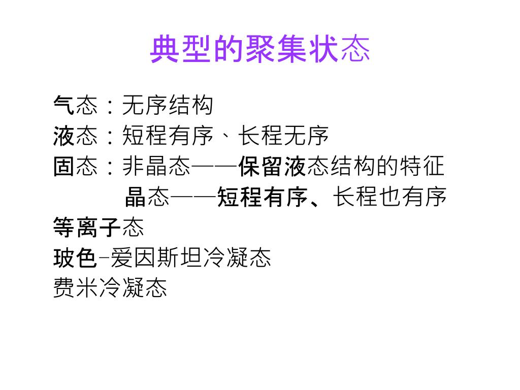 典型的聚集状态 气态:无序结构 液态:短程有序、长程无序 固态:非晶态——保留液态结构的特征 晶态——短程有序、长程也有序 等离子态 玻色-爱因斯坦冷凝态 费米冷凝态