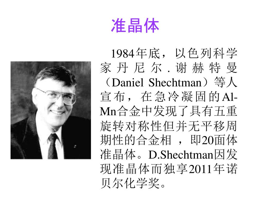 准晶体 1984年底,以色列科学家丹尼尔.谢赫特曼(Daniel Shechtman)等人宣布,在急冷凝固的Al-Mn合金中发现了具有五重旋转对称性但并无平移周期性的合金相 ,即20面体准晶体。D.Shechtman因发现准晶体而独享2011年诺贝尔化学奖。