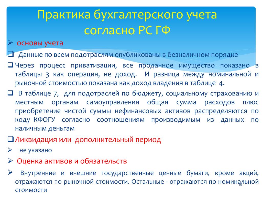 Практика бухгалтерского учета согласно РС ГФ • основы учета • Данные по всем подотраслям опубликованы в безналичном порядке • Через процесс приватизации, все проданное имущество показано в таблицы 3 как операция, не доход. И разница между номинальной и рыночной стоимостью показана как доход владения в таблице 4. • В таблице 7, для подотраслей по бюджету, социальному страхованию и местным органам самоуправления общая сумма расходов плюс приобретение чистой суммы нефинансовых активов распределяются по коду КФОГУ согласно соотношениям производимым из данных по наличным деньгам • Ликвидация или дополнительный период • не указано • Оценка активов и обязательств • Внутренние и внешние государственные ценные бумаги, кроме акций, отражаются по рыночной стоимости. Остальные - отражаются по номинальной стоимости