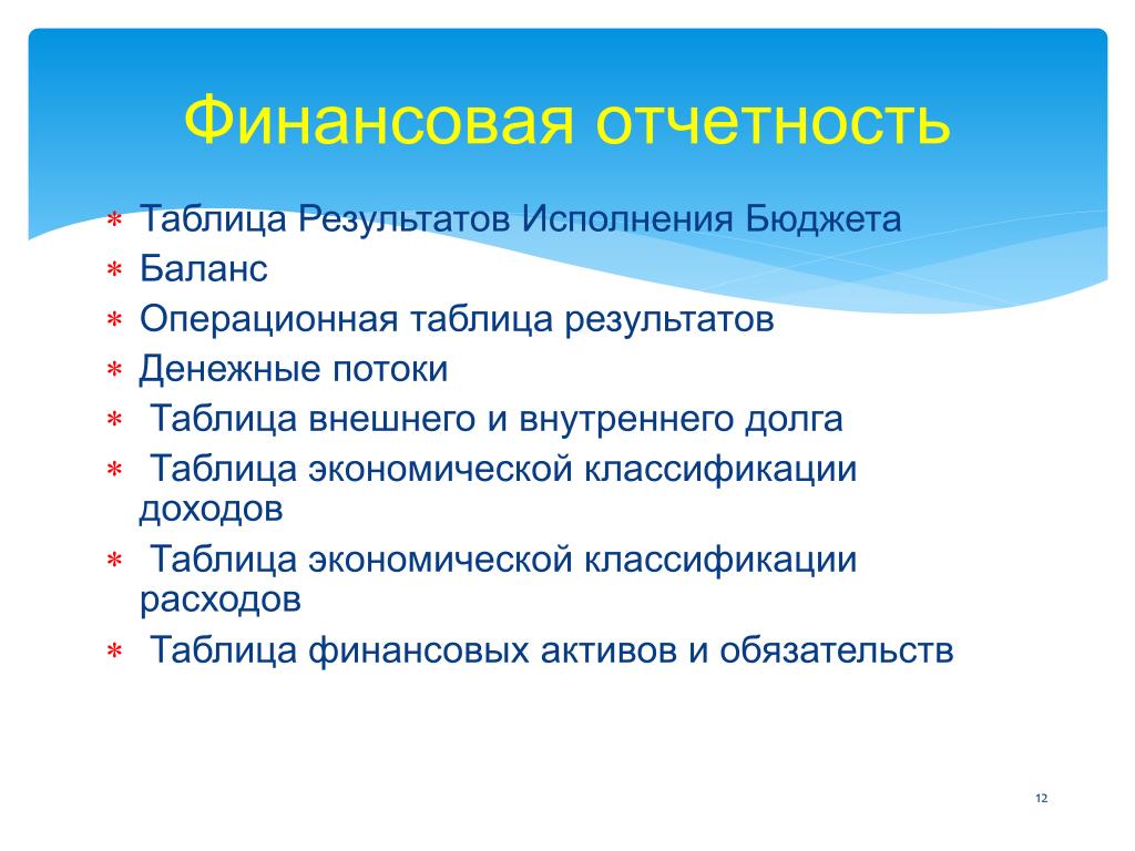 Финансовая отчетность Таблица Результатов Исполнения Бюджета Баланс Операционная таблица результатов Денежные потоки Таблица внешнего и внутреннего долга Таблица экономической классификации доходов Таблица экономической классификации расходов Таблица финансовых активов и обязательств