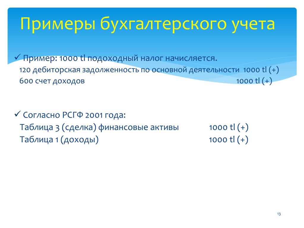 Примеры бухгалтерского учета • Пример: 1000 tlподоходный налог начисляется. 120 дебиторская задолженность по основной деятельности 1000 tl(+) 600 счет доходов 1000 tl (+) • Согласно РСГФ 2001 года: Таблица 3 (сделка) финансовые активы 1000 tl (+) Таблица 1 (доходы) 1000 tl (+)