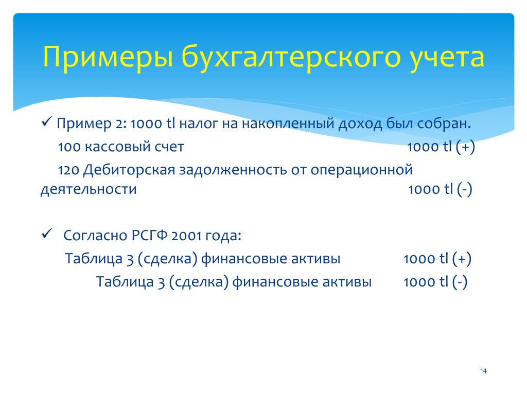 Примеры бухгалтерского учета • Пример 2: 1000 tl налог на накопленный доход был собран. 100 кассовый счет 1000 tl (+) 120 Дебиторская задолженность от операционной деятельности 1000 tl (-) • Согласно РСГФ 2001 года: Таблица 3 (сделка) финансовые активы 1000 tl (+) Таблица3 (сделка) финансовые активы 1000 tl (-)