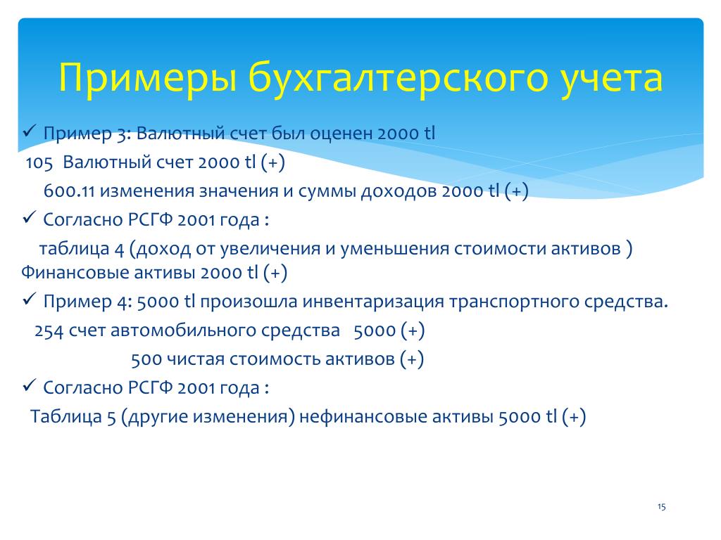 Примеры бухгалтерского учета • Пример 3: Валютный счет был оценен 2000 tl 105 Валютный счет 2000 tl (+) 600.11 изменения значения и суммы доходов 2000 tl (+) • Согласно РСГФ 2001 года : таблица 4 (доход от увеличения и уменьшения стоимости активов ) Финансовые активы 2000 tl (+) • Пример 4: 5000 tl произошла инвентаризация транспортного средства. 254 счет автомобильного средства 5000 (+) 500 чистая стоимость активов (+) • Согласно РСГФ 2001 года : Таблица 5 (другие изменения) нефинансовые активы 5000 tl (+)