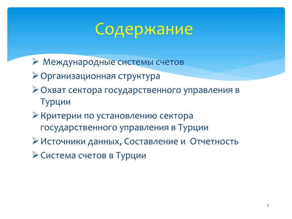 Содержание • Международные системы счетов • Организационная структура • Охват сектора государственного управления в Турции • Критерии по установлению сектора государственного управления в Турции • Источники данных, Составление и Отчетность • Система счетов в Турции
