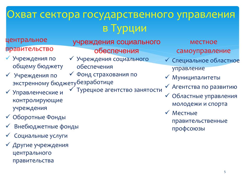 Охват сектора государственного управления в Турции • учреждения социального обеспечения • Учреждения социального обеспечения • Фонд страхования по безработице • Турецкое агентство занятости • местное самоуправление • Специальное областное управление • Муниципалитеты • Агентства по развитию • Областные управления молодежи и спорта • Местные правительственные профсоюзы центральное правительство • Учреждения по общему бюджету • Учреждения по экстренному бюджету • Управленческие и контролирующие учреждения • Оборотные Фонды • Внебюджетные фонды • Социальные услуги • Другие учреждения центрального правительства