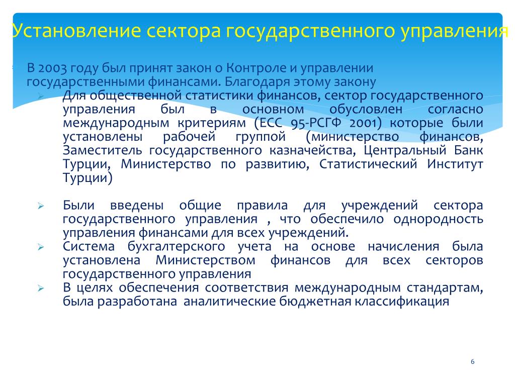 Установление сектора государственного управления • В 2003 году был принят закон о Контроле и управлении государственными финансами. Благодаря этому закону • Для общественной статистики финансов, сектор государственного управления был в основном обусловлен согласно международным критериям (ЕСС 95-РСГФ 2001) которые были установлены рабочей группой (министерство финансов, Заместитель государственного казначейства, Центральный Банк Турции, Министерство по развитию, Статистический Институт Турции) • Были введены общие правила для учреждений сектора государственного управления , что обеспечило однородность управления финансами для всех учреждений. • Система бухгалтерского учета на основе начисления была установлена Министерством финансов для всех секторов государственного управления • В целях обеспечения соответствия международным стандартам, была разработана аналитические бюджетная классификация
