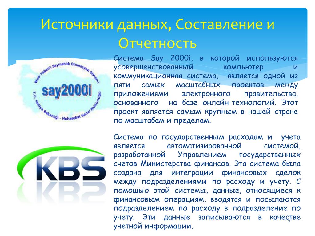 Источники данных, Составление и Отчетность Система Say 2000i, в которой используются усовершенствованный компьютер и коммуникационная система, является одной из пяти самых масштабных проектов между приложениями электронного правительства, основанного на базе онлайн-технологий. Этот проект является самым крупным в нашей стране по масштабам и пределам. Система по государственным расходам и учета является автоматизированной системой, разработанной Управлением государственных счетов Министерства финансов. Эта система была создана для интеграции финансовых сделок между подразделениями по расходу и учету. С помощью этой системы, данные, относящиеся к финансовым операциям, вводятся и посылаются подразделением по расходу в подразделение по учету. Эти данные записываются в качестве учетной информации.