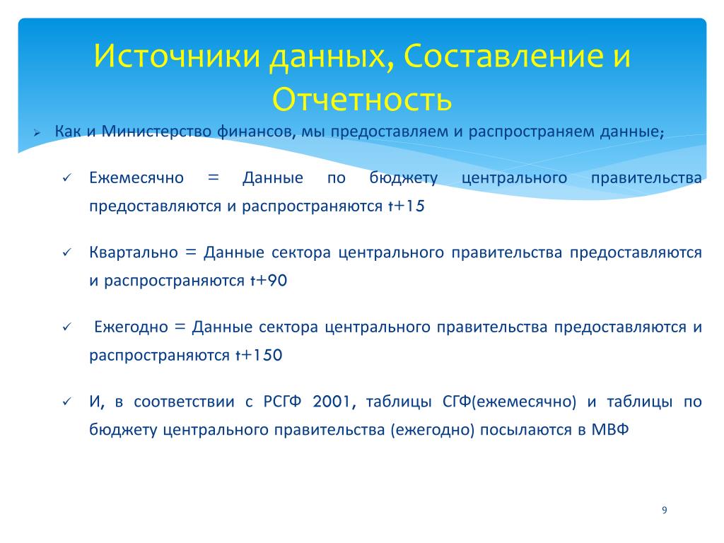 Источники данных, Составление и Отчетность • Как и Министерство финансов, мы предоставляем и распространяем данные; • Ежемесячно = Данные по бюджету центрального правительства предоставляются и распространяются t+15 • Квартально = Данные сектора центрального правительства предоставляются и распространяются t+90 • Ежегодно = Данные сектора центрального правительства предоставляются и распространяются t+150 • И, в соответствии с РСГФ 2001, таблицы СГФ(ежемесячно) и таблицы по бюджету центрального правительства (ежегодно) посылаются в МВФ