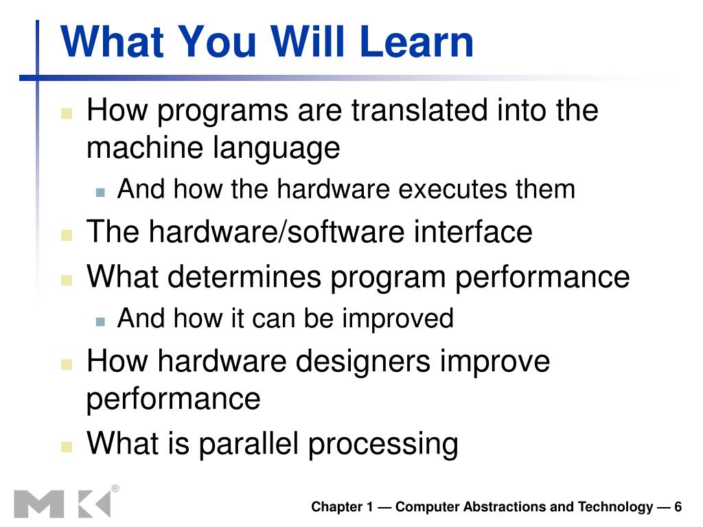 What You Will Learn • How programs are translated into the machine language • And how the hardware executes them • The hardware/software interface • What determines program performance • And how it can be improved • How hardware designers improve performance • What is parallel processing Chapter 1 — Computer Abstractions and Technology — 6