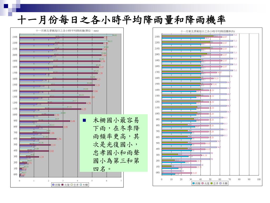 十一月份每日之各小時平均降雨量和降雨機率 • 木柵國小最容易下雨,在冬季降雨頻率更高,其次是光復國小,忠孝國小和雨聲國小為第三和第四名。