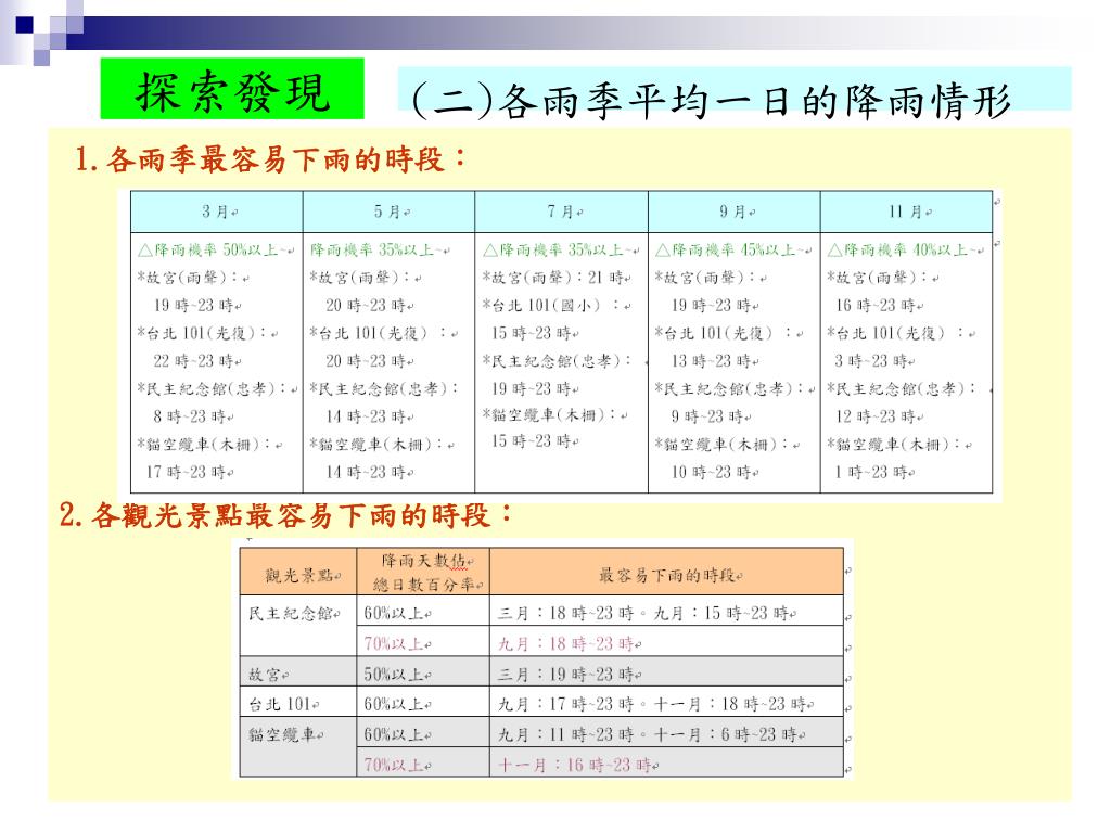 探索發現 (二)各雨季平均一日的降雨情形 1.各雨季最容易下雨的時段:2.各觀光景點最容易下雨的時段: