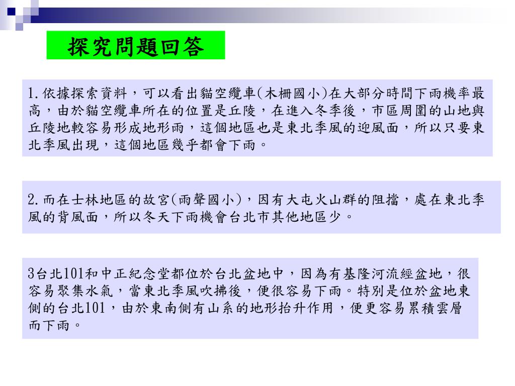 探究問題回答 1.依據探索資料,可以看出貓空纜車(木柵國小)在大部分時間下雨機率最高,由於貓空纜車所在的位置是丘陵,在進入冬季後,市區周圍的山地與丘陵地較容易形成地形雨,這個地區也是東北季風的迎風面,所以只要東北季風出現,這個地區幾乎都會下雨。 2.而在士林地區的故宮(雨聲國小),因有大屯火山群的阻擋,處在東北季風的背風面,所以冬天下雨機會台北市其他地區少。 3台北101和中正紀念堂都位於台北盆地中,因為有基隆河流經盆地,很容易聚集水氣,當東北季風吹拂後,便很容易下雨。特別是位於盆地東側的台北101,由於東南側有山系的地形抬升作用,便更容易累積雲層而下雨。