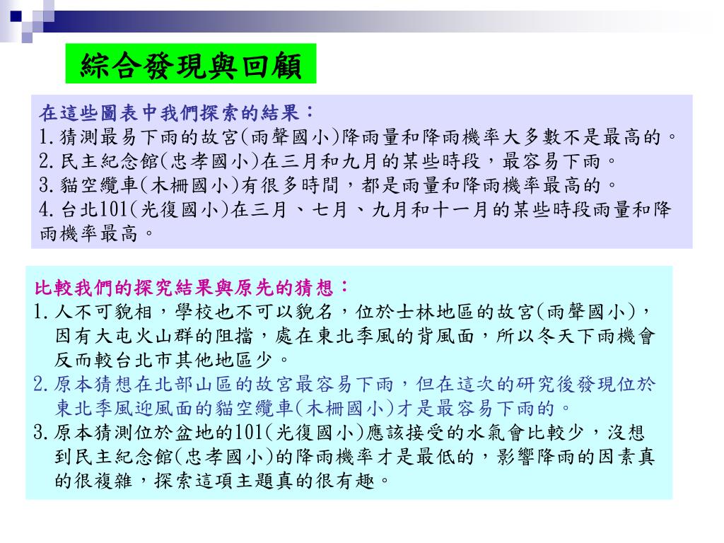 綜合發現與回顧 在這些圖表中我們探索的結果:1.猜測最易下雨的故宮(雨聲國小)降雨量和降雨機率大多數不是最高的。2.民主紀念館(忠孝國小)在三月和九月的某些時段,最容易下雨。3.貓空纜車(木柵國小)有很多時間,都是雨量和降雨機率最高的。4.台北101(光復國小)在三月、七月、九月和十一月的某些時段雨量和降雨機率最高。 比較我們的探究結果與原先的猜想:1.人不可貌相,學校也不可以貌名,位於士林地區的故宮(雨聲國小), 因有大屯火山群的阻擋,處在東北季風的背風面,所以冬天下雨機會 反而較台北市其他地區少。2.原本猜想在北部山區的故宮最容易下雨,但在這次的研究後發現位於 東北季風迎風面的貓空纜車(木柵國小)才是最容易下雨的。3.原本猜測位於盆地的101(光復國小)應該接受的水氣會比較少,沒想 到民主紀念館(忠孝國小)的降雨機率才是最低的,影響降雨的因素真 的很複雜,探索這項主題真的很有趣。