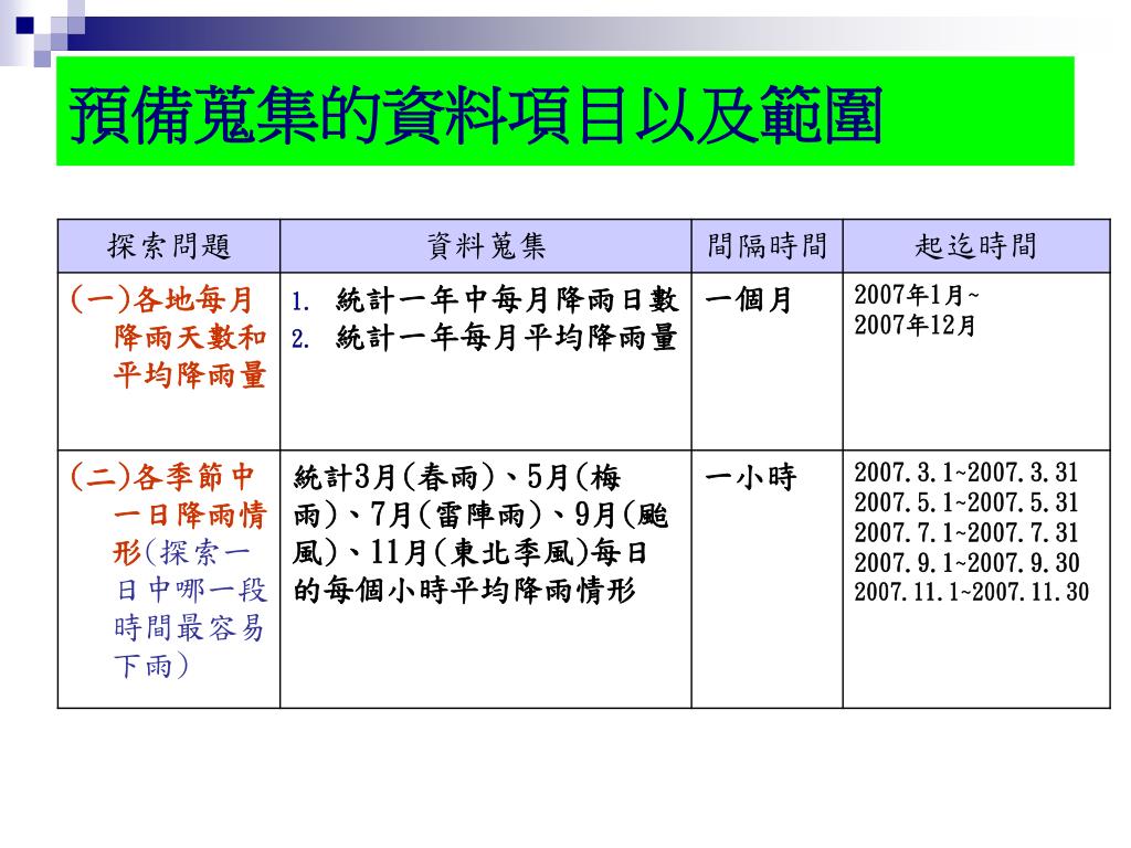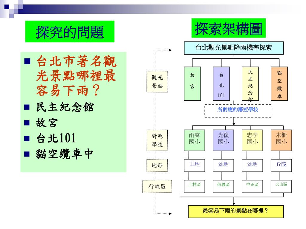 台北觀光景點降雨機率探索 故宮 台北 101 民主紀念館 貓空纜車 觀光 景點 所對應的鄰近學校 對應 學校 雨聲 國小 光復 國小 忠孝 國小 木柵 國小 地形 山地 盆地 盆地 丘陵 行政區 士林區 信義區 中正區 文山區 最容易下雨的景點在哪裡? 探究的問題 探索架構圖 • 台北市著名觀光景點哪裡最容易下雨? • 民主紀念館 • 故宮 • 台北101 • 貓空纜車中