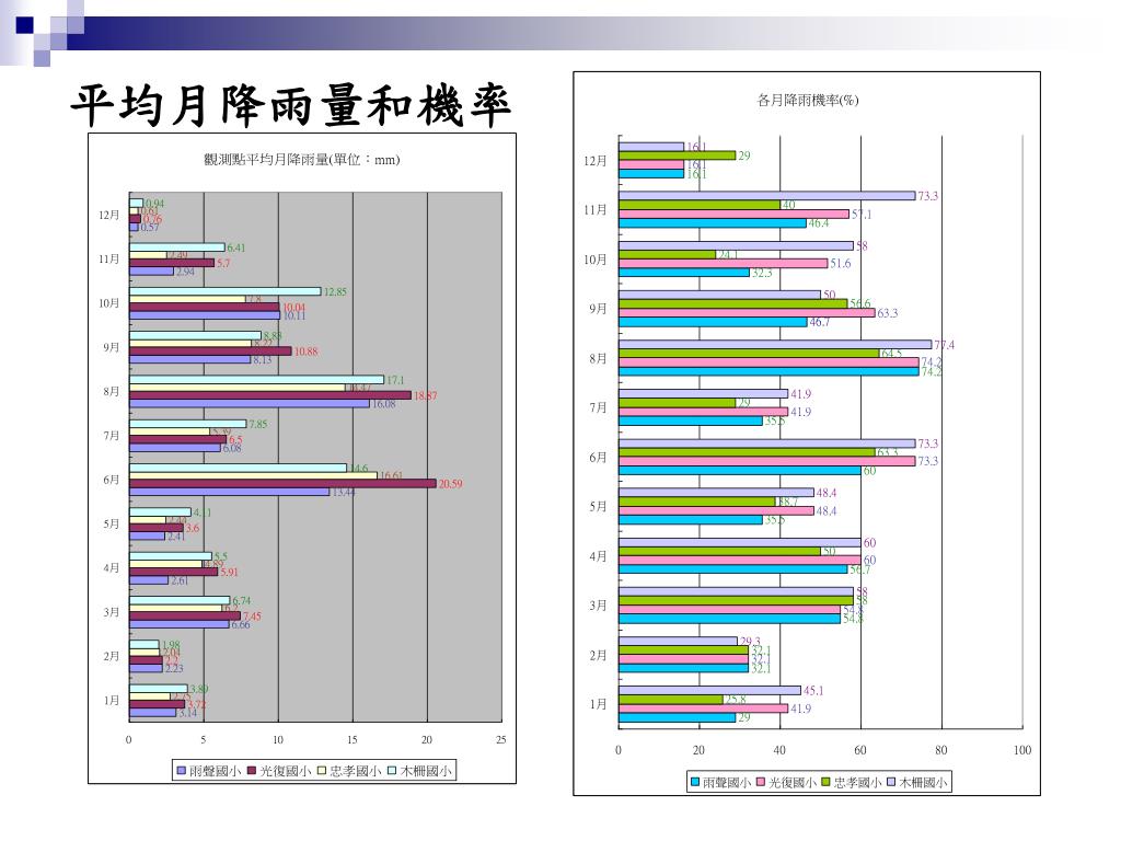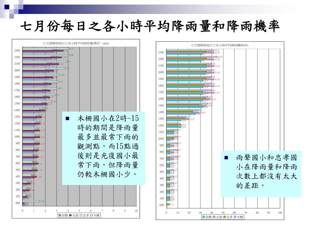 七月份每日之各小時平均降雨量和降雨機率 • 木柵國小在2時~15時的期間是降雨量最多並最常下雨的觀測點,而15點過後則是光復國小最常下雨,但降雨量仍較木柵國小少。 • 雨聲國小和忠孝國小在降雨量和降雨次數上都沒有太大的差距。