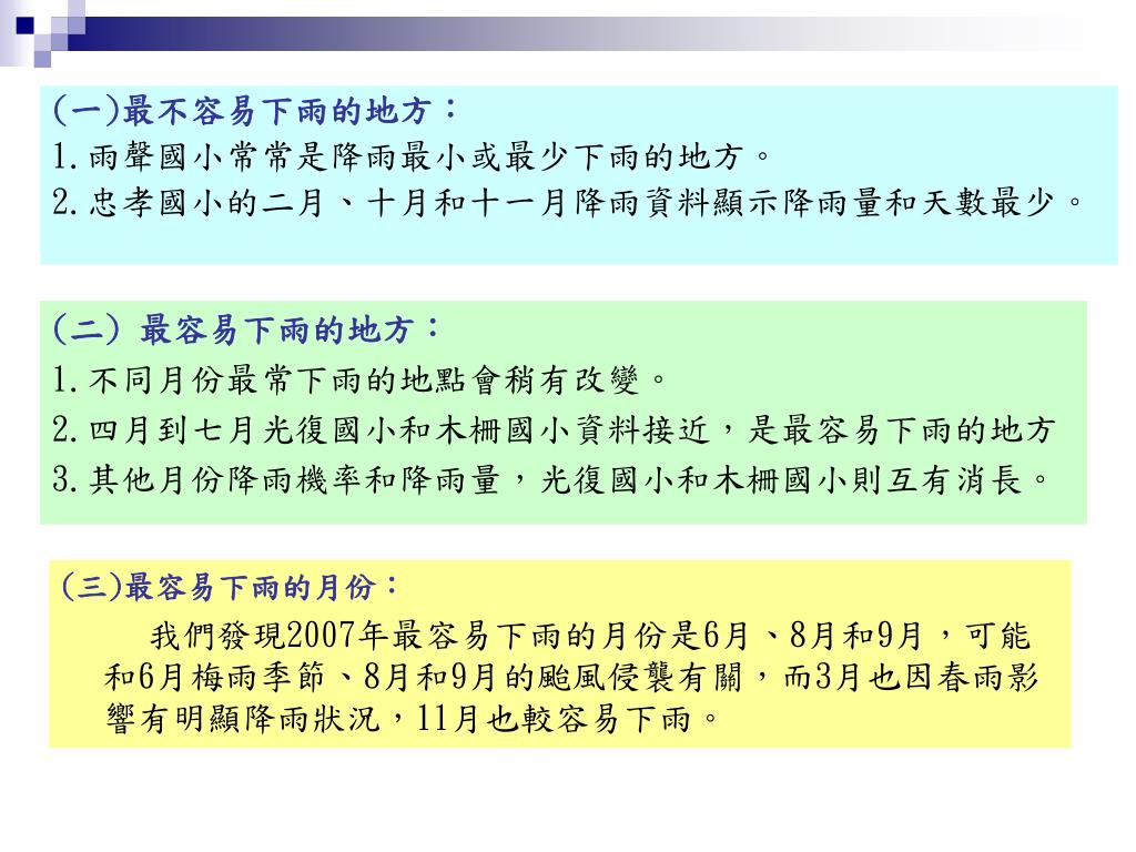(一)最不容易下雨的地方: 1.雨聲國小常常是降雨最小或最少下雨的地方。 2.忠孝國小的二月、十月和十一月降雨資料顯示降雨量和天數最少。 (二) 最容易下雨的地方: 1.不同月份最常下雨的地點會稍有改變。 2.四月到七月光復國小和木柵國小資料接近,是最容易下雨的地方 3.其他月份降雨機率和降雨量,光復國小和木柵國小則互有消長。 (三)最容易下雨的月份: 我們發現2007年最容易下雨的月份是6月、8月和9月,可能和6月梅雨季節、8月和9月的颱風侵襲有關,而3月也因春雨影響有明顯降雨狀況,11月也較容易下雨。