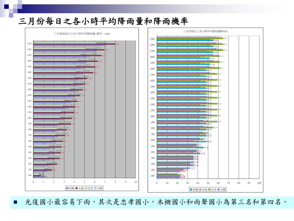 三月份每日之各小時平均降雨量和降雨機率 • 光復國小最容易下雨,其次是忠孝國小,木柵國小和雨聲國小為第三名和第四名。