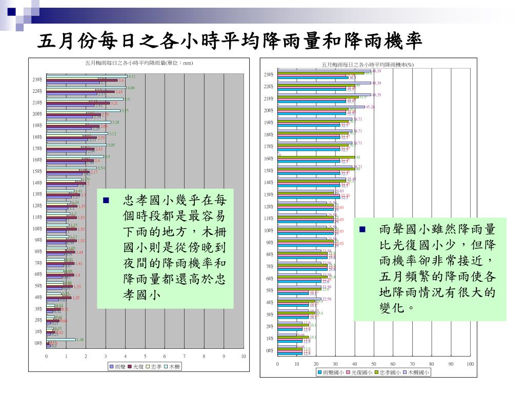五月份每日之各小時平均降雨量和降雨機率 • 忠孝國小幾乎在每個時段都是最容易下雨的地方,木柵國小則是從傍晚到夜間的降雨機率和降雨量都還高於忠孝國小 • 雨聲國小雖然降雨量比光復國小少,但降雨機率卻非常接近,五月頻繁的降雨使各地降雨情況有很大的變化。