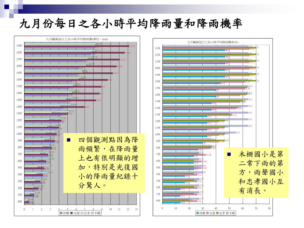 九月份每日之各小時平均降雨量和降雨機率 • 四個觀測點因為降雨頻繁,在降雨量上也有很明顯的增加,特別是光復國小的降雨量紀錄十分驚人。 • 木柵國小是第二常下雨的第方,雨聲國小和忠孝國小互有消長。