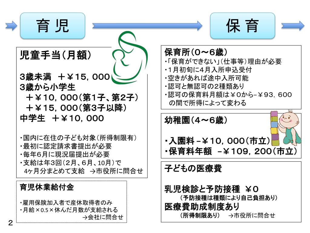 育児 保育 保育所(0〜6歳) ・「保育ができない」(仕事等)理由が必要 ・1月初旬に4月入所申込受付 ・空きがあれば途中入所可能 ・認可と無認可の2種類あり ・認可の保育料月額は¥0から−¥93,600 の間で所得によって変わる 児童手当(月額) 3歳未満 +¥15,000 3歳から小学生 +¥10,000(第1子、第2子) +¥15,000(第3子以降) 中学生 +¥10,000 ・国内に在住の子ども対象(所得制限有) ・最初に認定請求書提出が必要 ・毎年6月に現況届提出が必要 ・支給は年3回(2月、6月、10月)で4ヶ月分まとめて支給 →市役所に問合せ 幼稚園(4〜6歳) ・入園料 −¥10,000(市立) ・保育料年額 −¥109,200(市立) 子どもの医療費 乳児検診と予防接種¥0 (予防接種は種類により自己負担あり) 医療費助成制度あり (所得制限あり) →市役所に問合せ 育児休業給付金 ・雇用保険加入者で産休取得者のみ ・月給×0.5×休んだ月数が支給される →会社に問合せ 2