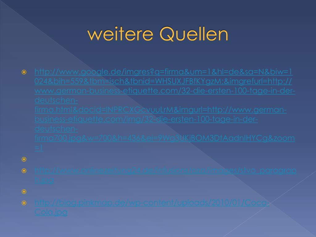 weitere Quellen • http://www.google.de/imgres?q=firma&um=1&hl=de&sa=N&biw=1024&bih=559&tbm=isch&tbnid=WHSUXJFBfKYgzM:&imgrefurl=http://www.german-business-etiquette.com/32-die-ersten-100-tage-in-der-deutschen-firma.html&docid=lNPRCXGcvuuLrM&imgurl=http://www.german-business-etiquette.com/img/32-die-ersten-100-tage-in-der-deutschen-firma700.jpg&w=700&h=436&ei=9Wg3UKjBOM3DtAadnIHYCg&zoom=1 • http://www.onlinezeitung24.de/infusions/oza/images/stvo_paragraph.jpg • http://blog.pinkmap.de/wp-content/uploads/2010/01/Coca-Cola.jpg