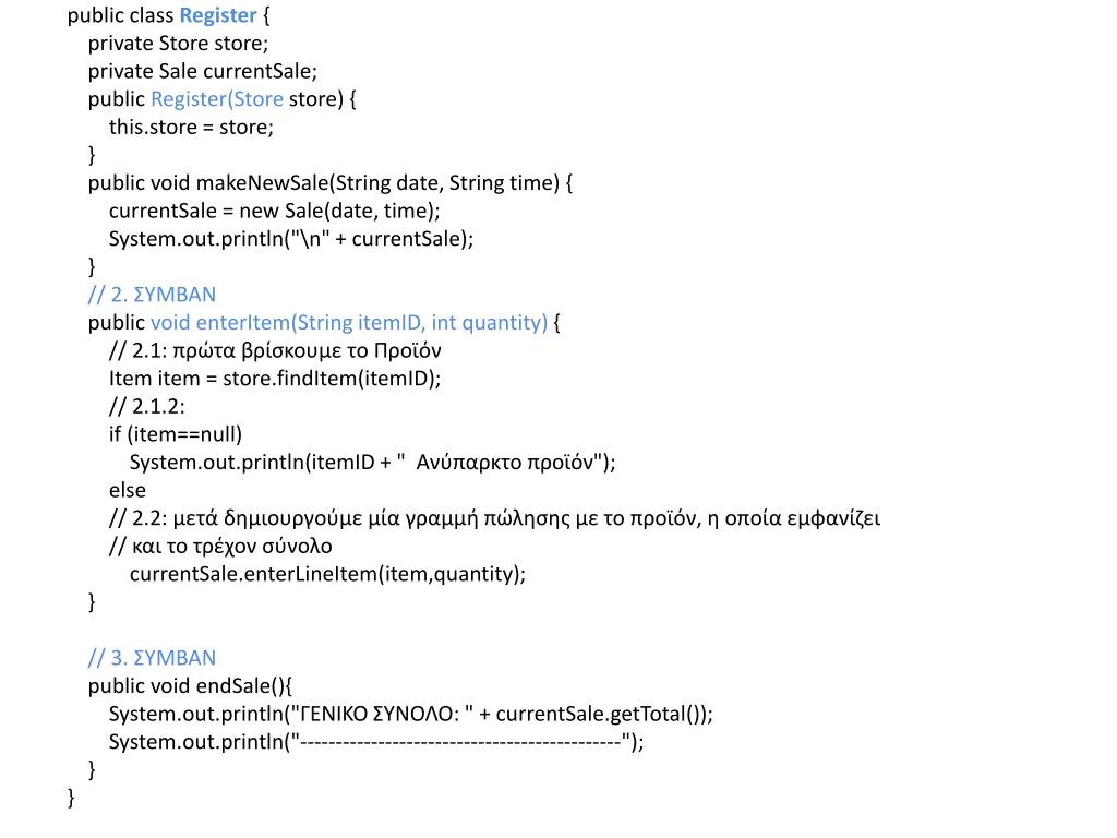 Ο κώδικας σε Java public class ProcesSaleHandler{ public static void main(String[] args) { Store store = new Store(); Register reg = new Register(store); store.addRegister(reg); // ΣΥΜΒΑΝ 1: makeNewSale() reg.makeNewSale("19/3/2010", "10:24"); // ΣΥΜΒΑΝ 2: enterItem(itemID, quantity) - Επαναληπτική διαδικασία... // εισάγουμε τον κωδικό του προϊόντος και την ποσότητα reg.enterItem("x1", 4); // εισάγουμε ένα ακόμη προϊόν με την ποσότητα reg.enterItem("x7", 3); // εισάγουμε ένα ακόμη προϊόν με την ποσότητα reg.enterItem("x5", 2); // ΣΥΜΒΑΝ 3: reg.endSale(); // ΣΥΜΒΑΝ 4: makePayment(amount) } }