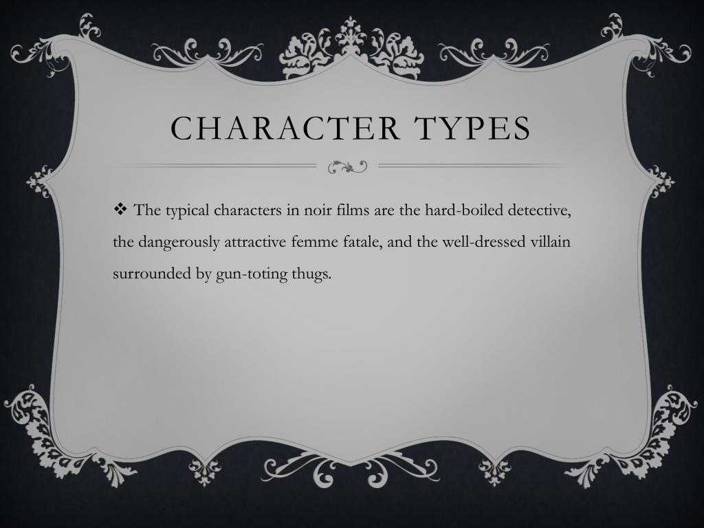 Character Types • The typical characters in noir films are the hard-boiled detective, the dangerously attractive femme fatale, and the well-dressed villain surrounded by gun-toting thugs.