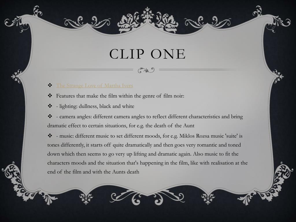 Clip One • The Strange Love of Martha Ivers • Features that make the film within the genre of film noir: • - lighting: dullness, black and white • - camera angles: different camera angles to reflect different characteristics and bring dramatic effect to certain situations, for e.g. the death of the Aunt • - music: different music to set different moods, for e.g. MiklosRozsa music 'suite' is tones differently, it starts off quite dramatically and then goes very romantic and toned down which then seems to go very up lifting and dramatic again. Also music to fit the characters moods and the situation that's happening in the film, like with realisation at the end of the film and with the Aunts death
