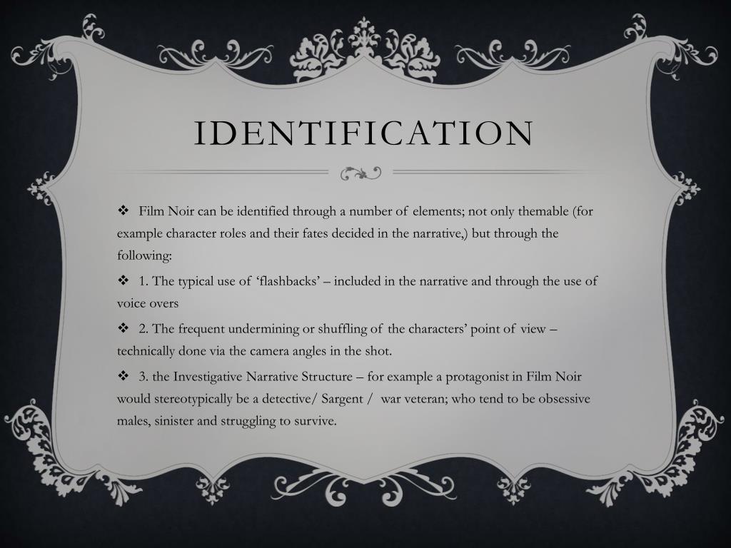 Identification • Film Noir can be identified through a number of elements; not only themable (for example character roles and their fates decided in the narrative,) but through the following: • 1. The typical use of ‘flashbacks’ – included in the narrative and through the use of voice overs • 2. The frequent undermining or shuffling of the characters’ point of view – technically done via the camera angles in the shot. • 3. the Investigative Narrative Structure – for example a protagonist in Film Noir would stereotypically be a detective/ Sargent / war veteran; who tend to be obsessive males, sinister and struggling to survive.