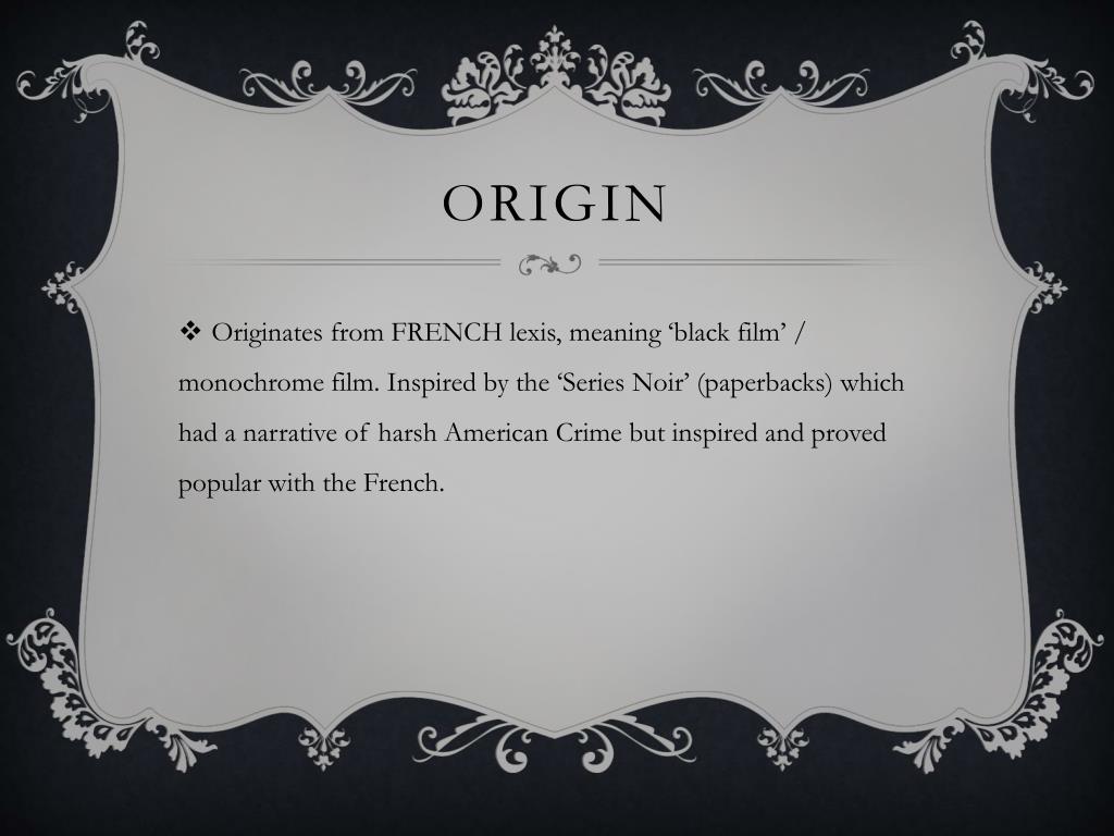 Origin • Originates from FRENCH lexis, meaning ‘black film’ / monochrome film. Inspired by the ‘Series Noir’ (paperbacks) which had a narrative of harsh American Crime but inspired and proved popular with the French.